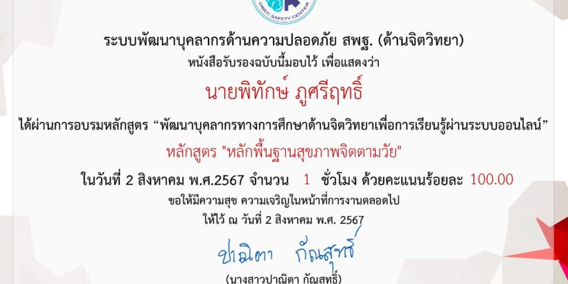 ผ่านการอบรมหลักสูตร “พัฒนาบุคลากรทางการศึกษาด้านจิตวิทยาเพื่อการเรียนรู้ผ่านระบบออนไลน์” หลักสูตร “หลักพื้นฐานสุขภาพจิตตามวัย” Posted on 2 สิงหาคม 2024 by admin แนะแนวเรื่อง « ต้อนรับคณะกรรมการที่ปรึกษา/พี่เลี้ยง (Coaching) ได้เข้าเยี่ยมชมบริบทของสถานศึกษาผ่านการอบรมหลักสูตร “พัฒนาบุคลากรทางการศึกษาด้านจิตวิทยาเพื่อการเรียบรู้ผ่านระบบออนไลน์” หลักสูตร “การปรับพฤติกรรมเชิงบวก” »