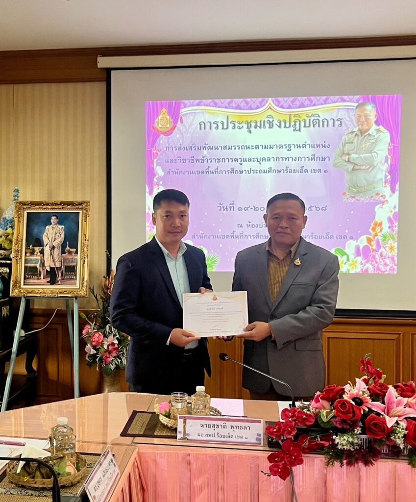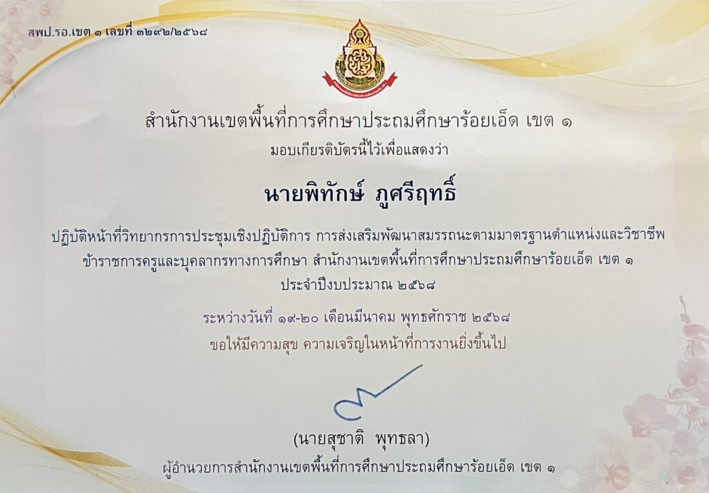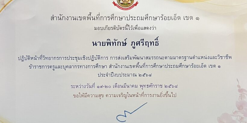 เป็นวิทยากรการประชุมเชิงปฏิบัติการ การส่งเสริมพัฒนาสมรรถนะตามมาตรฐานตำแหน่งและวิชาชีพ ข้าราชการครูและบุคลากรทางการศึกษา สำนักงานเขตพื้นที่การศึกษาประถมศึกษาร้อยเอ็ด เขต 1 ประจำปีงบประมาณ 2568 Posted on 19 มีนาคม 2025 by admin แนะแนวเรื่อง « พิธีปัจฉิมนิเทศ นักเรียนชั้นประถมศึกษาปีที่ 6 ปีการศึกษา 2567เป็นวิทยากรการอบรมหลักสูตร “ผู้ดำเนินการคัดกรองคนพิการทางการศึกษา” ตามแนบท้ายประกาศคณะกรรมการการพิจารณาให้คนพิการได้รับสิทธิช่วยเหลือทางการศึกษา เรื่อง กำหนด หลักเกณฑ์และวิธีการ การรับรองบุคคลของสถานศึกษาว่าเป็นคนพิการ สำนักงานคณะกรรมการการศึกษาขั้นพื้นฐาน กระทรวงศึกษาธิการ »