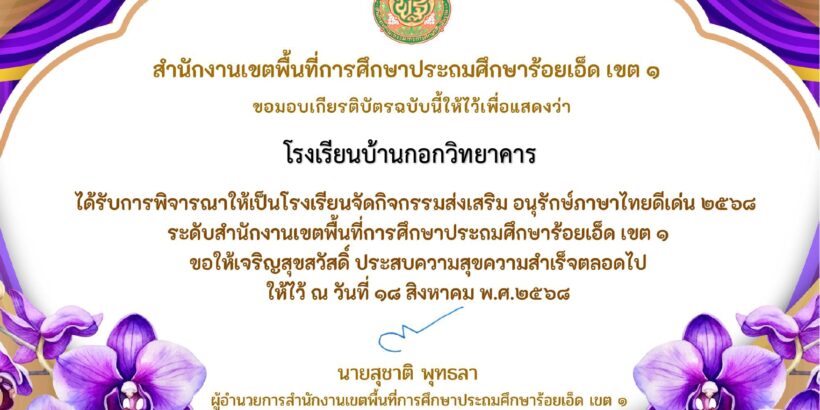 ขอแสดงความยินดี กับ โรงเรียนบ้านกอกวิทยาคาร ได้รับการพิจารณาให้เป็น โรงเรียนจัดกิจกรรมส่งเสริม อนุรักษ์ภาษาไทยดีเด่น 2568 ระดับสำนักงานเขตพื้นที่การศึกษาประถมศึกษาร้อยเอ็ด เขต 1 และ คุณครูภฤศญา ตระกุลมงคล ได้รับการพิจารณาให้เป็น ผู้จัดกิจกรรมส่งเสริม อนุรักษ์ภาษาไทยดีเด่น 2568 ระดับสำนักงานเขตพื้นที่การศึกษาประถมศึกษาร้อยเอ็ด เขต 1