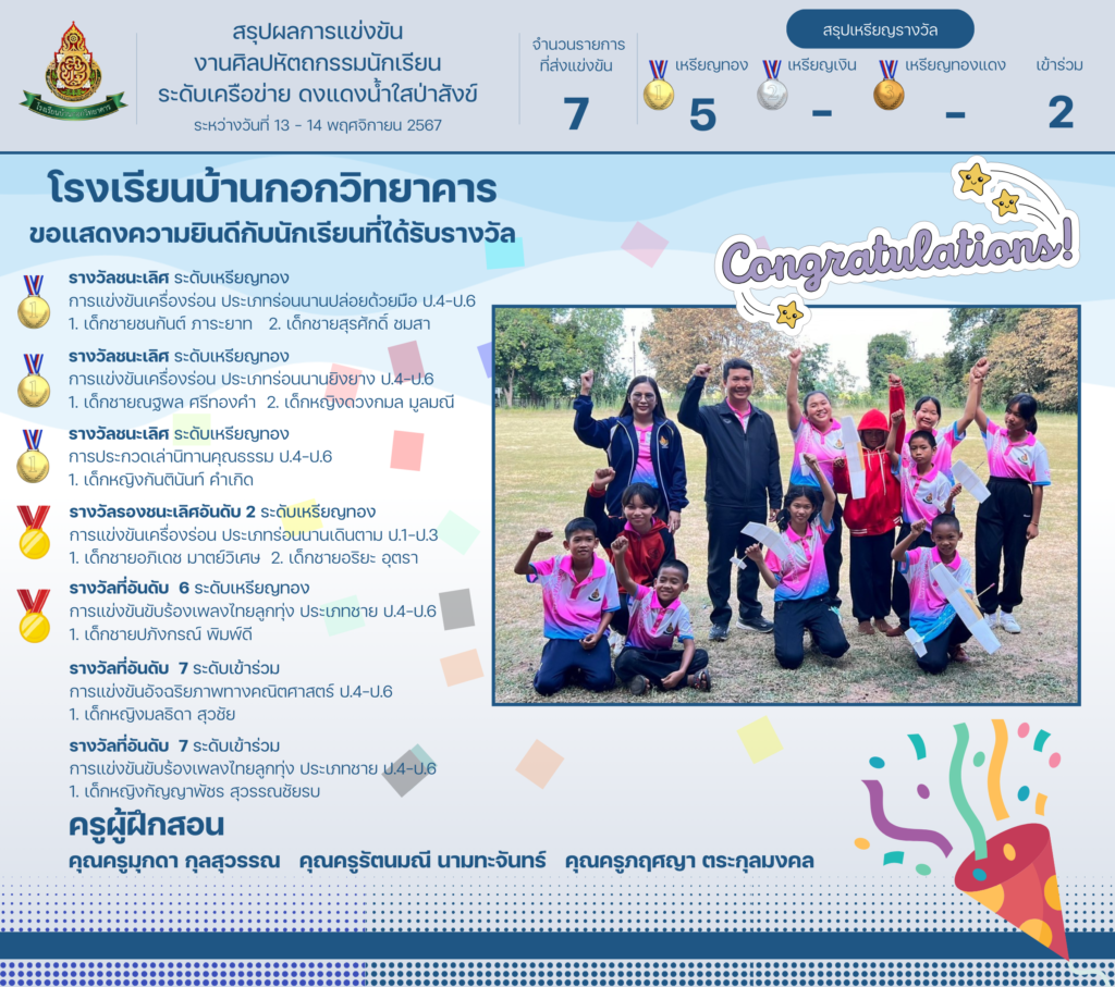 - ขอแสดงความยินดีกับนักเรียนที่ได้รับรางวัล ในการแข่งขันงานศิลปหัตถกรรมนักเรียน ระดับเครือข่ายดงแดงน้ำใสป่าสังข์